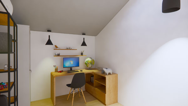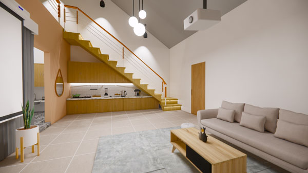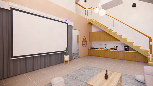 Olah karena itu, di ruangan ini, dilengapi dengan kebutuhan rumah minimal seperti ruang tidur, ruang kerja, kamar mandi, dapur dan ruang tamu. Dimana ruang tamu ini, nanti bisa digunakan untuk warga atau pengurus untuk bisa cangkruk, ngobrol, nobar, dll, yang juga dilengkapi layar proyektor. Kopi dan camilan bisa masak sendiri di mini kitchen bawah tangga. Jadi gak perlu bawa dari rumah.