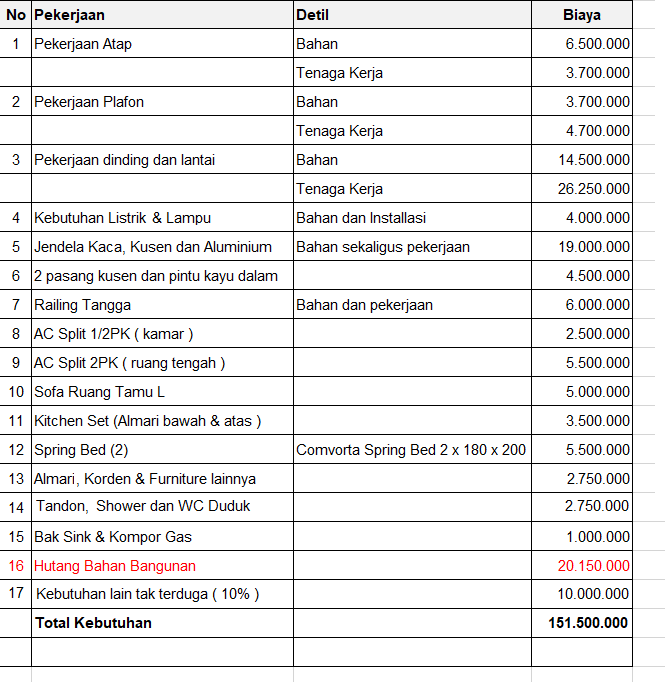 Untuk Kebutuhan Dana sampai dengan Finishing (khusus bangunan belakang), sampai dalam kondisi bisa dipakai sebagai ruang pertemuan dan Guest House, Insya Allah anggaran yang dibutuhkan sebagai berikut :