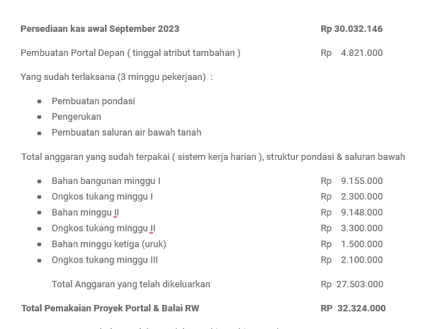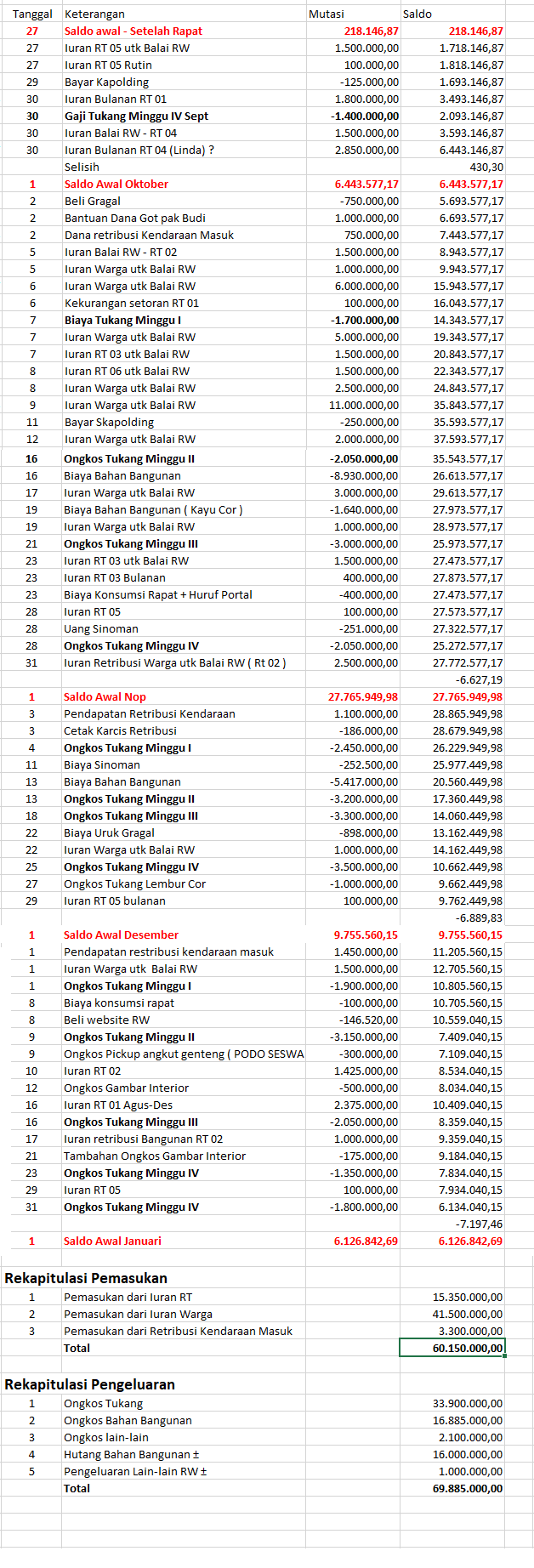 Sampai awal mulai pembangunan saat ini, kira-kira telah menghabiskan dana 110 juta-an. Dimana 20jutaa nya adalah masih berupa hutang ke galangan. Alhamdulilah sudah menyelesaikan konstruksi dasar dari bagian depan (aula), dan sebagian besar bagian belakang (ruang rumah & kantor) 80%. Kami sampaikan terima kasih atas partisipasi bapak-ibu sekalian warga Bumi Marina Emas yang sudah menyumbang sebagian rejekinya untuk mewujudkan balai RW kita.